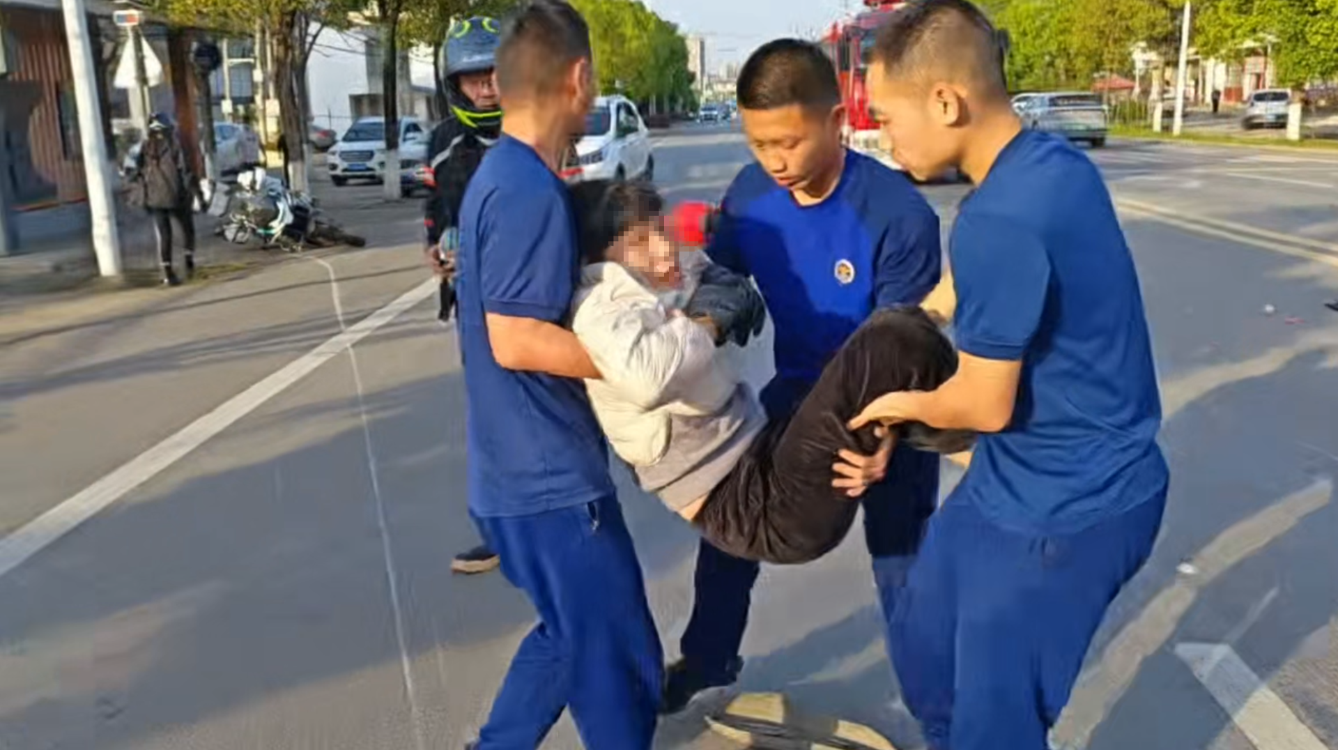 当日,消防救援人员驾乘救援车辆奔赴执勤任务区,行驶途中前方道路突发拥堵,伴随一声巨响,一辆摩托车与一辆电动车发生剧烈碰撞。强大的冲击力致使电动车车主被狠狠掀翻在地,重重摔在路面后瘫坐路中无法起身,面露痛苦之色,过往车辆纷纷紧急避让,现场秩序瞬间混乱,稍有不慎便极易引发二次交通事故,情况十分危急。