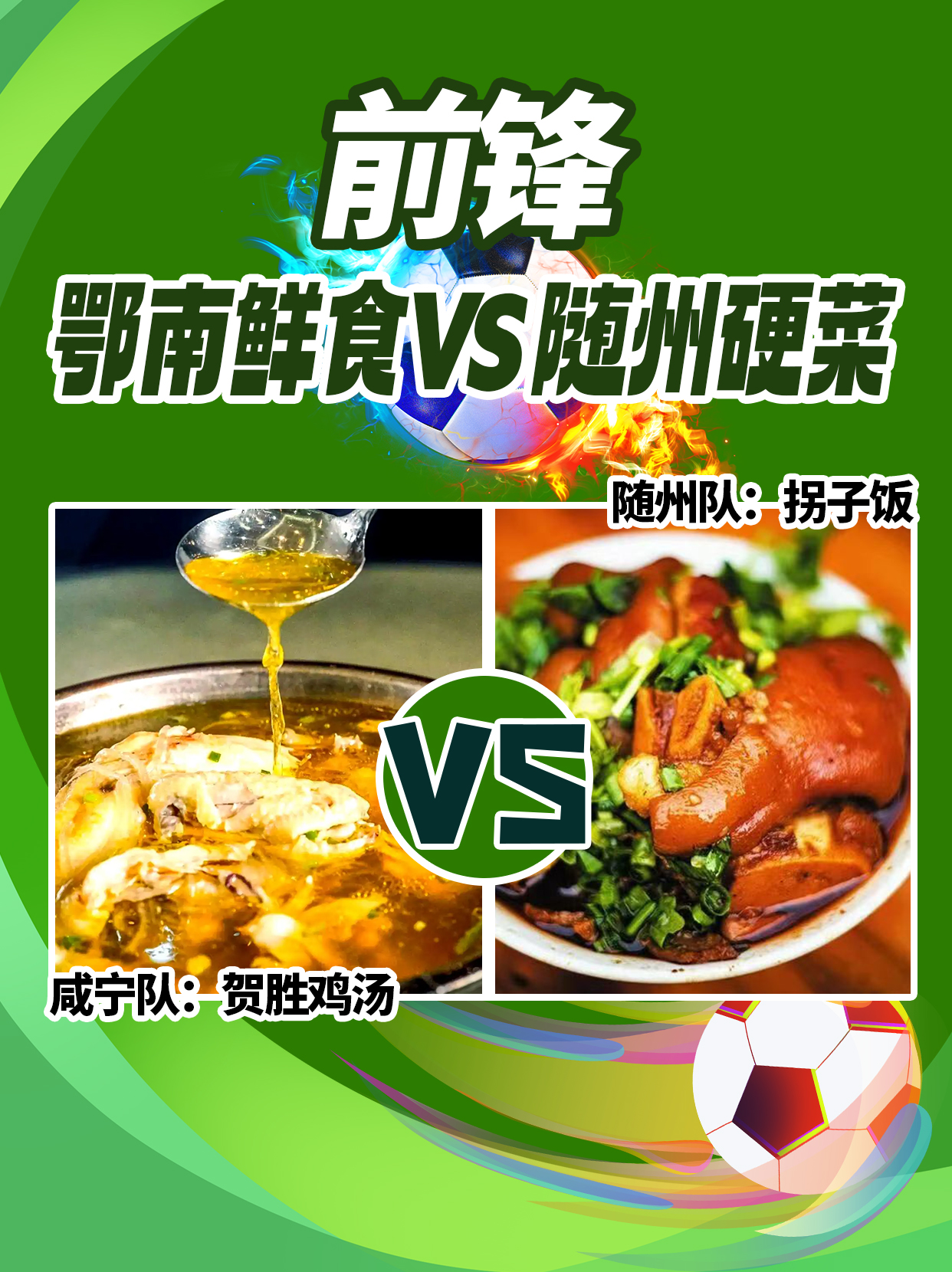 对位看点:鄂南鲜食对随州硬菜,贺胜鸡汤灵动渗透,拐子饭硬核碾压。两大舌尖前锋巅峰对决,谁能一剑封喉、斩获进球?