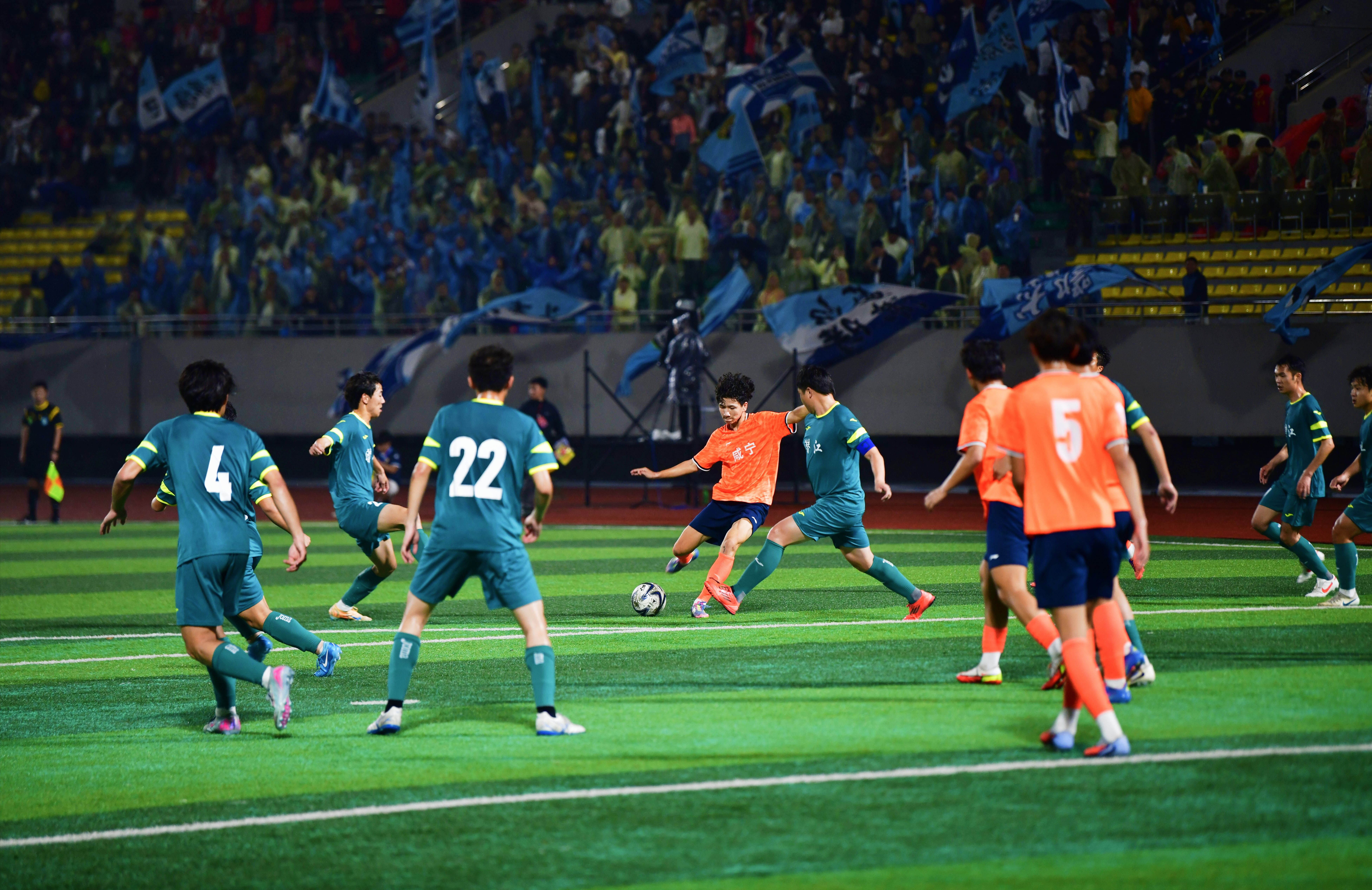 随着裁判一声哨响,比赛正式开打。咸宁队一改热身试探的姿态,开场便大举压上。第13分钟,咸宁队获得右侧角球机会,足球划出一道弧线坠向禁区中路,5号王子铮禁区内冷静推射,率先破门,1:0!整个文体中心瞬间沸腾,球员们相拥庆祝,看台上的鼓声和呐喊声此起彼伏。