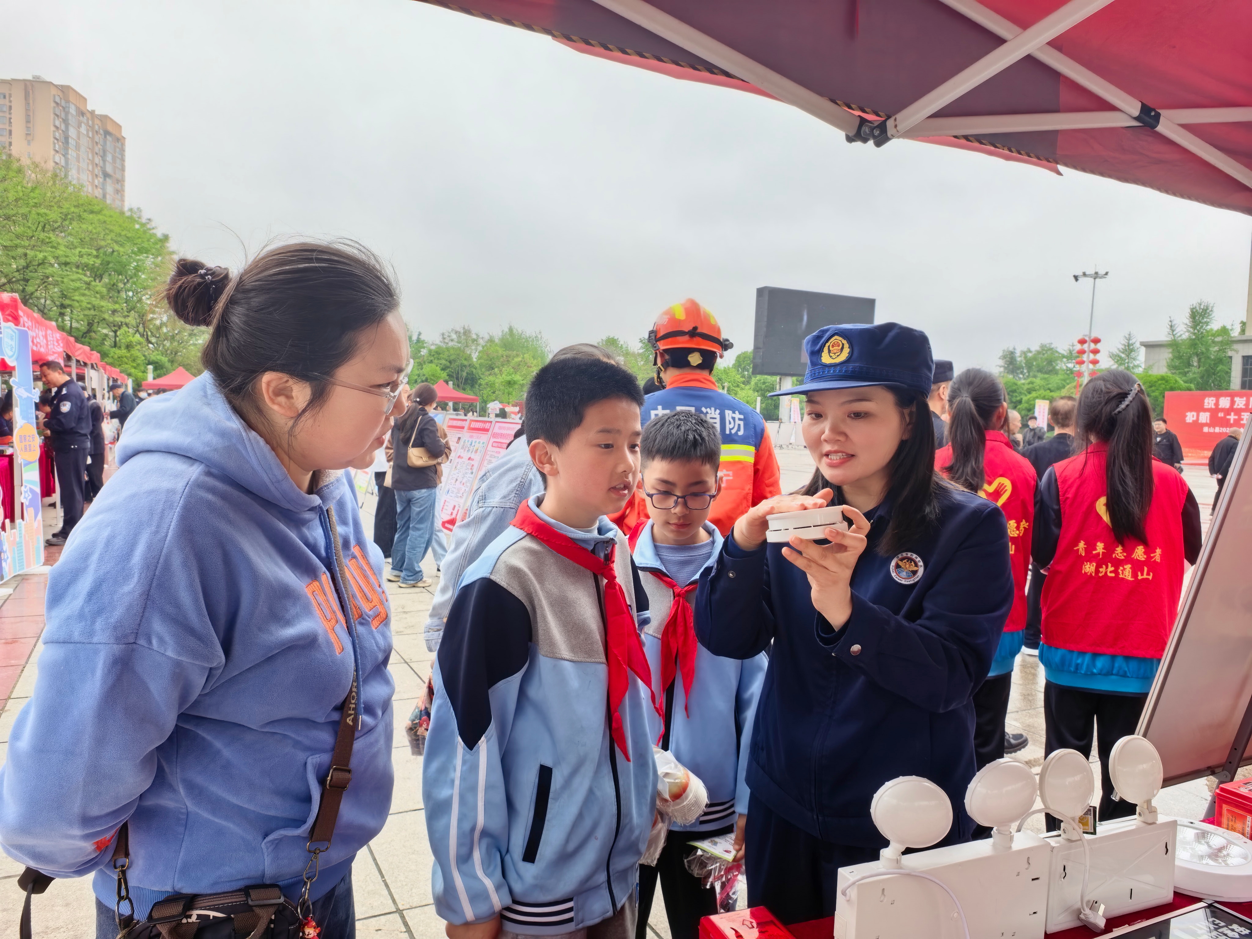 在通山县广场,宣教队员摆摊设点、面对面科普,通过发放宣传手册、现场讲解、答疑互动等形式,向群众普及消防安全常识。其间,消防员还展示了灭火防护服、液压破拆工具等常用消防救援装备,并上前邀请群众操作灭火器。“以前不知道灭火器要对着火源根部喷,今天现场学了,心里有底了!”参与体验的大爷说道。