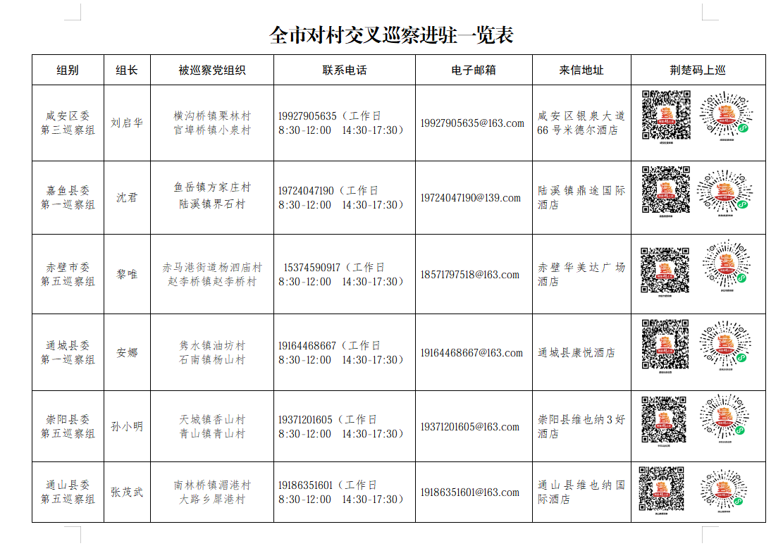 据悉,本轮巡察时间为1个月左右。巡察期间,各巡察组均设置了联系电话、意见箱和电子邮箱,开通了“荆楚码上巡”信访反映二维码,主要受理被巡察村“两委”成员关于违反政治纪律、组织纪律、廉洁纪律、群众纪律、工作纪律和生活纪律等方面的举报和反映,欢迎广大干部群众按照巡察受理范围实事求是地反映问题,鼓励实名举报。信访截止时间为5月15日。