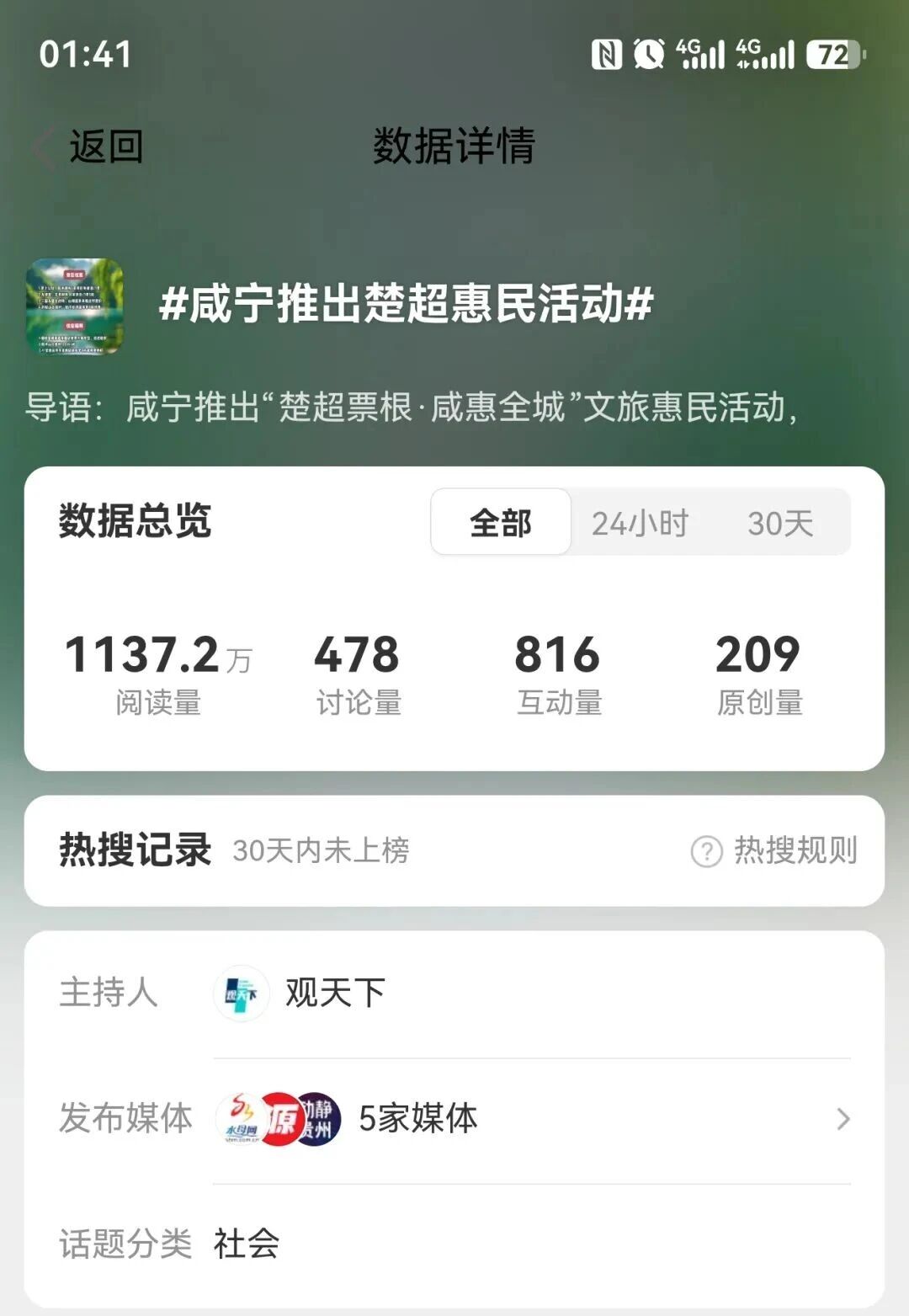 据统计,由咸宁市融媒体中心承接并负责的赛事全媒体直播,吸引354万余人次在线观看。微博话题“楚超遇上咸宁”与“咸宁推出楚超惠民活动”的阅读量双双突破千万,持续占据同城热搜榜前列,“楚超”赛事与咸宁城市的全网热度显著提升。
