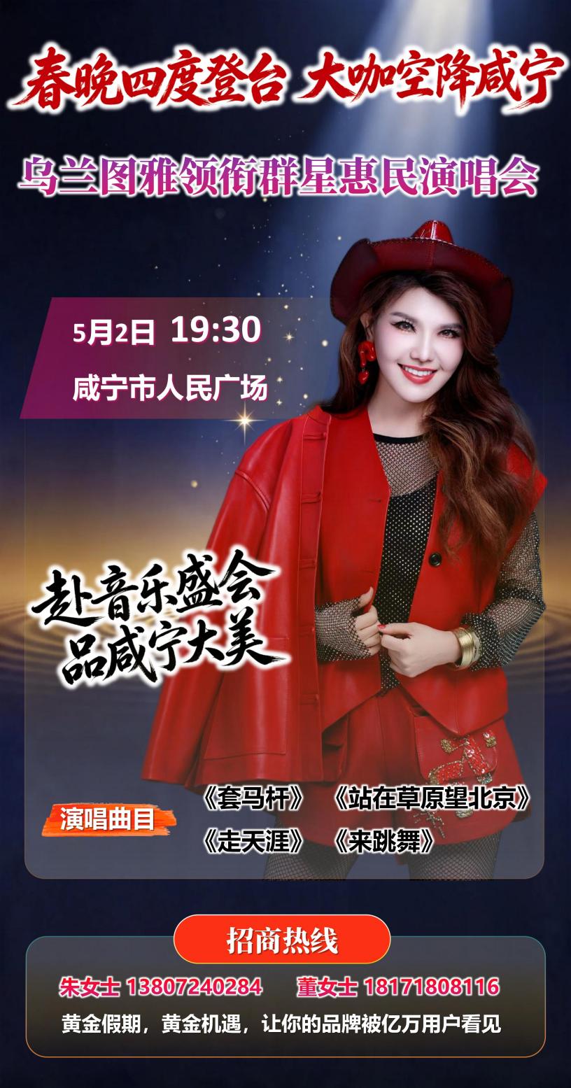 云上咸宁报道(记者 刘玉关)备受瞩目的“泡完温泉听场歌”2026咸宁市五一群星惠民演唱会将于5月2日在咸宁市人民广场温情启幕,一场集视听盛宴与惠民初心于一体的文化狂欢即将来袭。其中,最令人期待的亮点是——四度登上央视春晚的蒙古族实力唱将乌兰图雅将重磅空降演唱会现场,用高亢嘹亮的草原嗓音,为咸宁市民及游客献上一场穿越草原与香城的音乐邂逅。