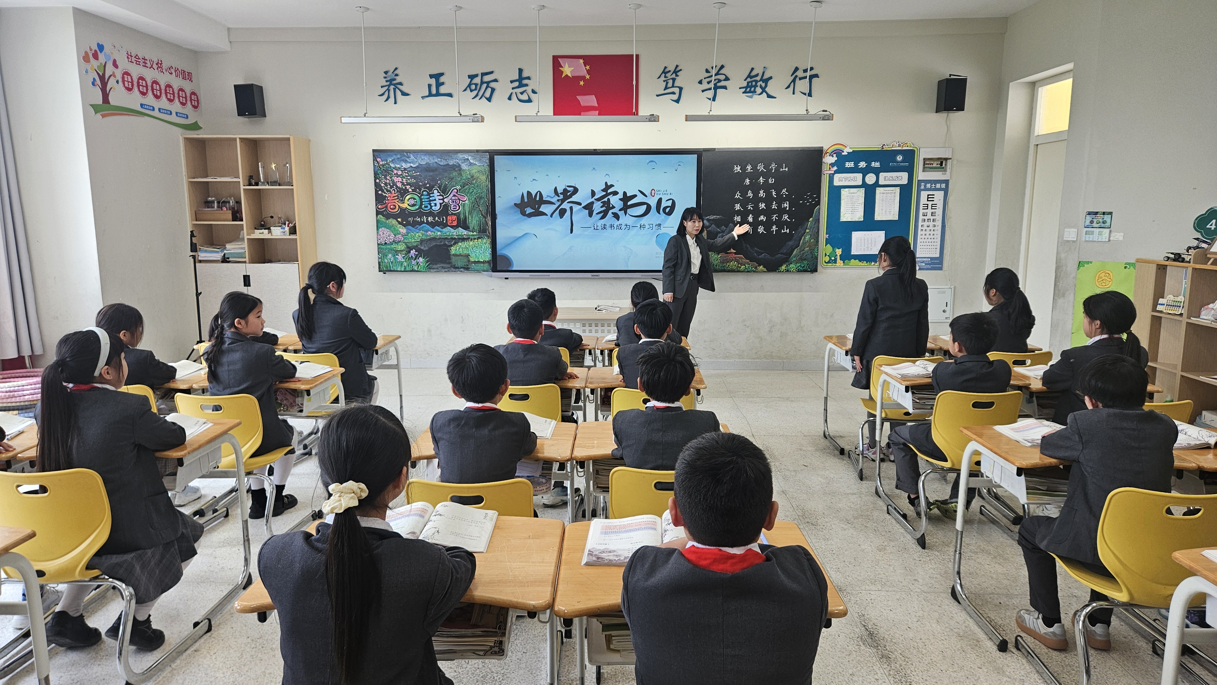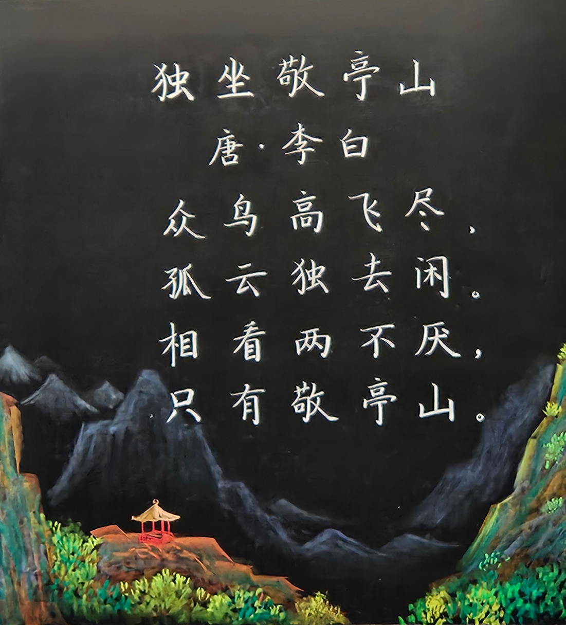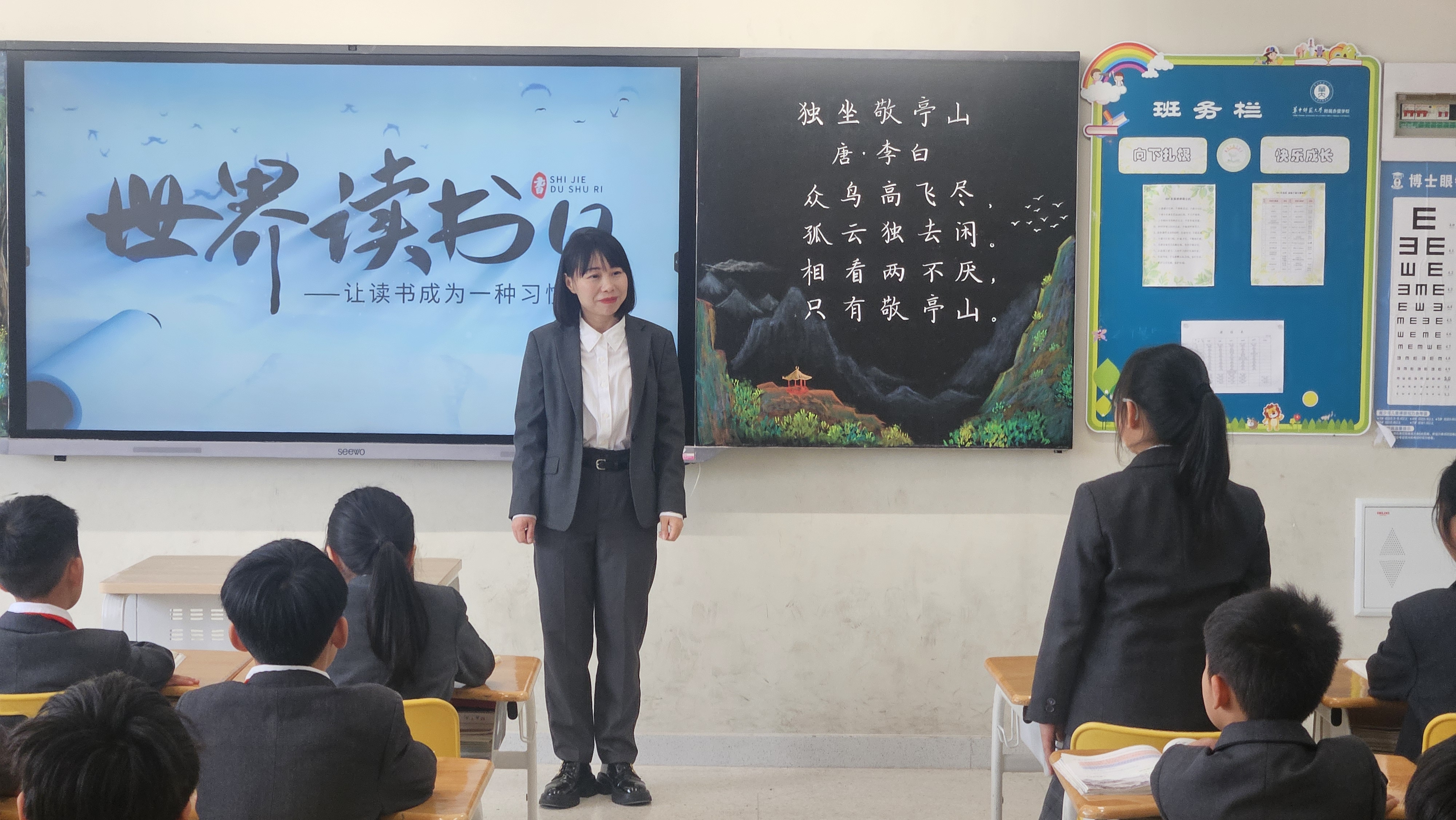 正在给学生授课的是华师元一赤壁学校小学部的语文老师龚艳华。黑板上这幅意境悠远、笔触简练的粉笔画就出自龚老师之手。从勾勒远山轮廓,到点缀飞鸟孤云,每一笔都是她亲手绘制。在世界读书日当天,她特意选择了《独坐敬亭山》这首充满画面感的古诗词,通过粉笔作画,将李白的诗意变成了教室里看得见的风景。