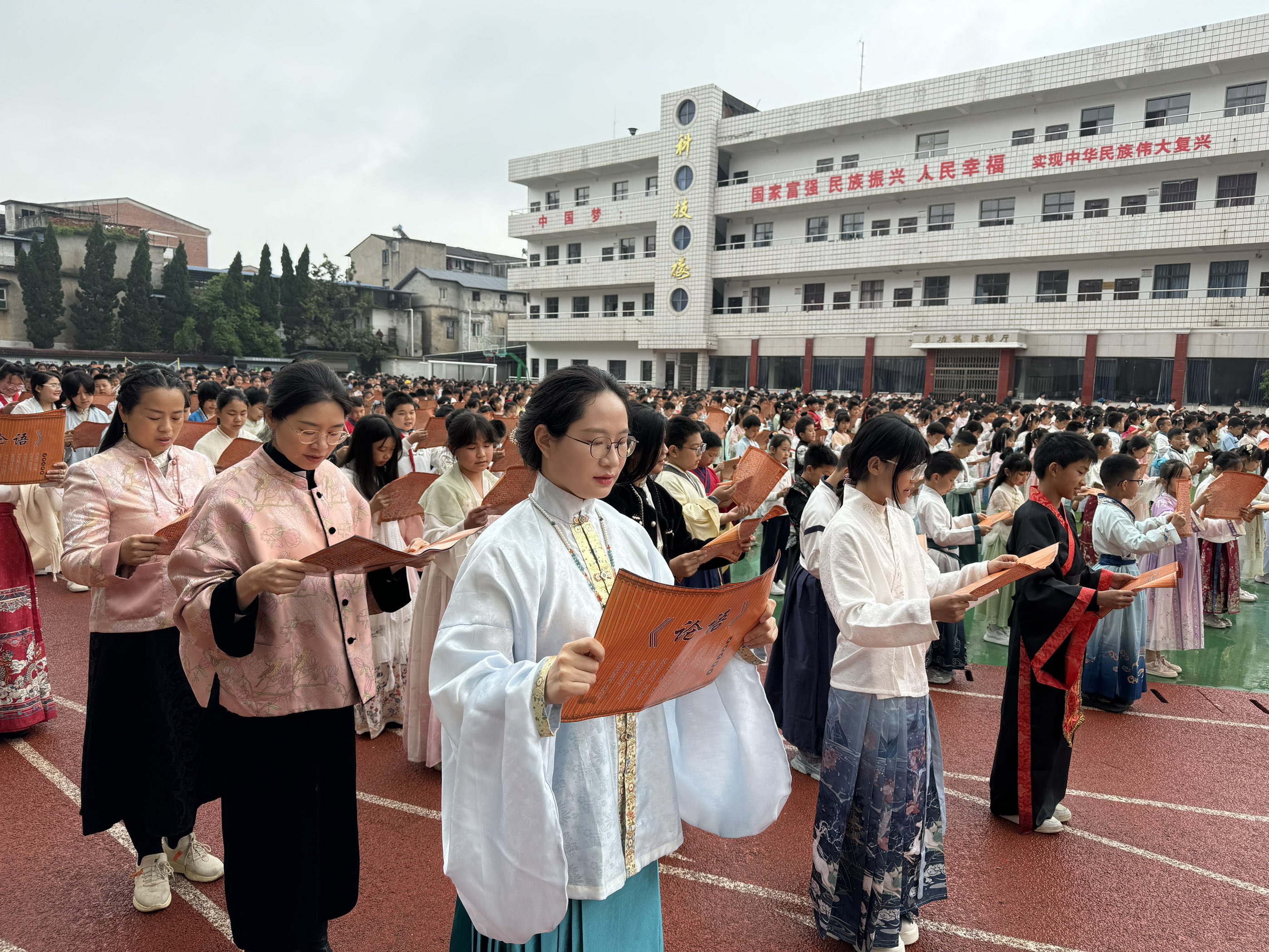 活动在庄严的升旗仪式中拉开帷幕。师生身着汉服行礼致敬,齐唱《礼运大同篇》,集体诵读《论语》篇章与横渠四句,尽显传统书香韵味。现场亮点突出,同学们化身《红楼梦》《西游记》等四大名著经典人物,生动演绎书中故事,让经典文学鲜活呈现。