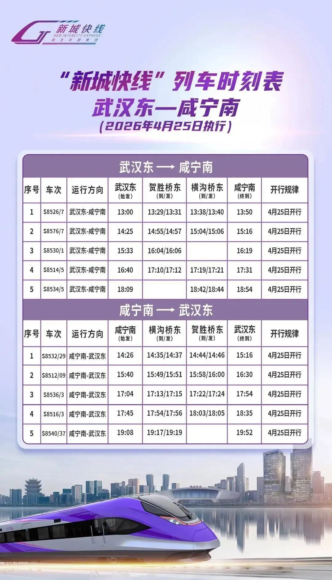 武咸城际“新城快线”依托既有武咸城际铁路,连接武汉东站、贺胜桥东站、横沟桥东站、咸宁南站,运营全程80公里,旅行时间45分钟。光谷至咸宁温泉景区缩至1小时。跑在线路上的列车是中车四方研制的CINOVA2.0型城际市域智能列车,起停快、乘降快,乘客无需对号入座,出站自动扣费,真正实现“随到随走”。