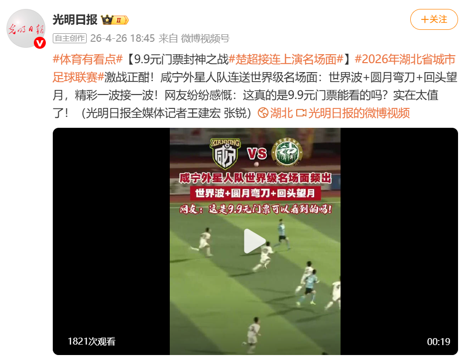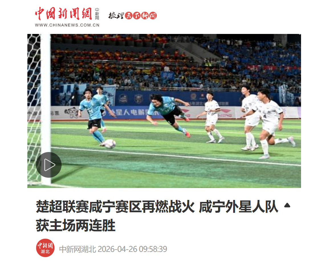 云上咸宁报道(记者 陈玲)4月25日晚,2026年湖北省城市足球联赛(楚超)咸宁赛区焦点战在崇阳县文体中心激情落幕。主场作战的咸宁外星人队以6:1力克神农架队,豪取主场两连胜。这场兼具竞技高光与城际温情的赛事,持续引爆舆论关注,先后被新华社、中国新闻网、光明日报、湖北日报、荆楚网、长江云等央省主流媒体密集聚焦、高频点赞,成为湖北群众体育蓬勃开展、区域互动走心走实、体文旅商深度融合的鲜活范本。赛场之内是酣畅淋漓的攻防对决,赛场之外是山海相拥的双向奔赴,更激活了一座城的消费活力与精神认同。
